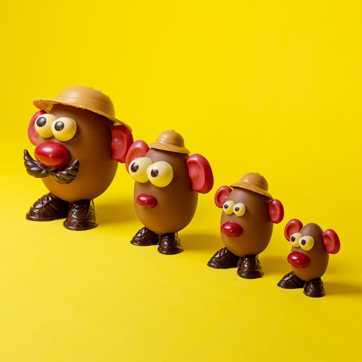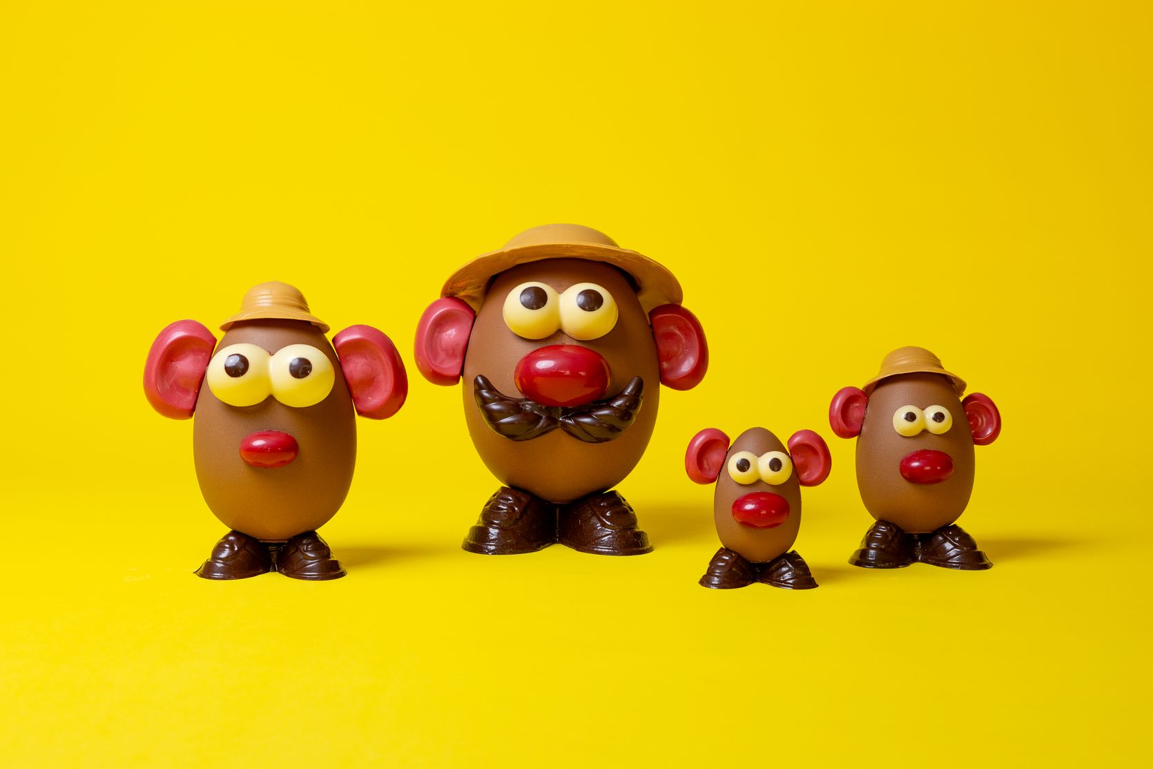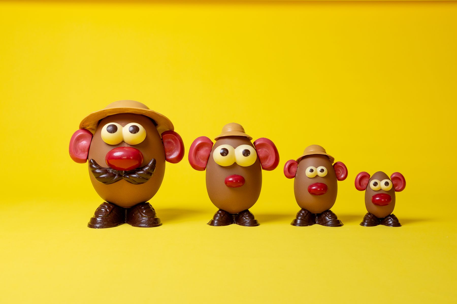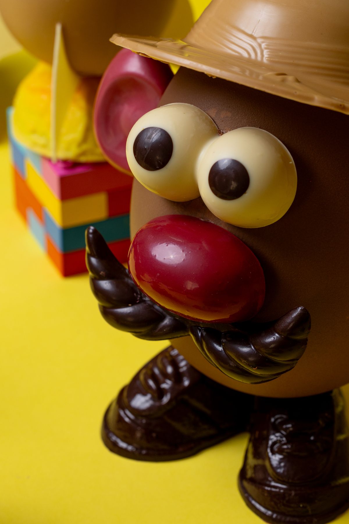 Sujet en chocolat lait 35% garni d’œufs pralinés faits maison et de fritures assorties au chocolat noir, lait blond et blanc :