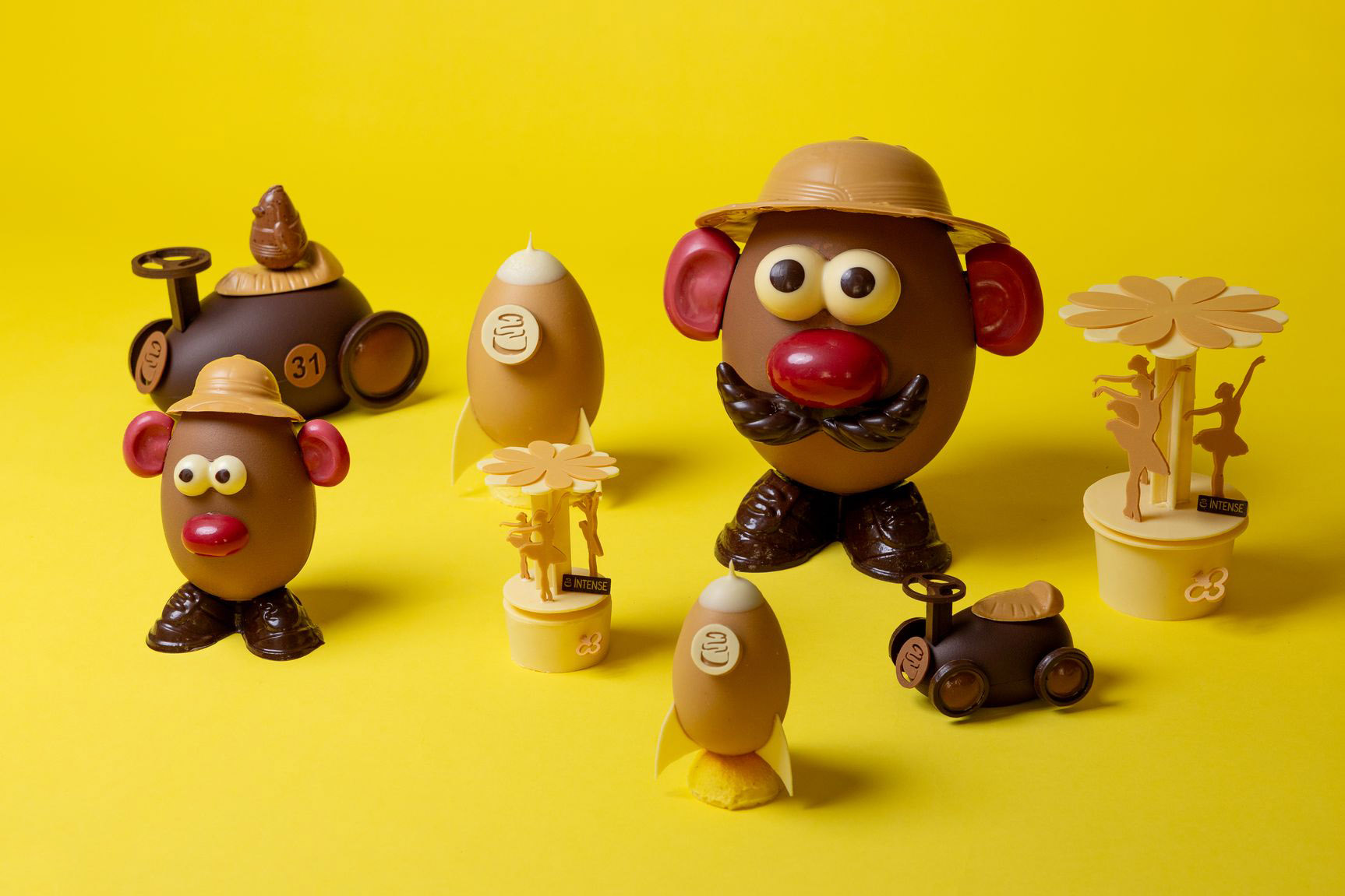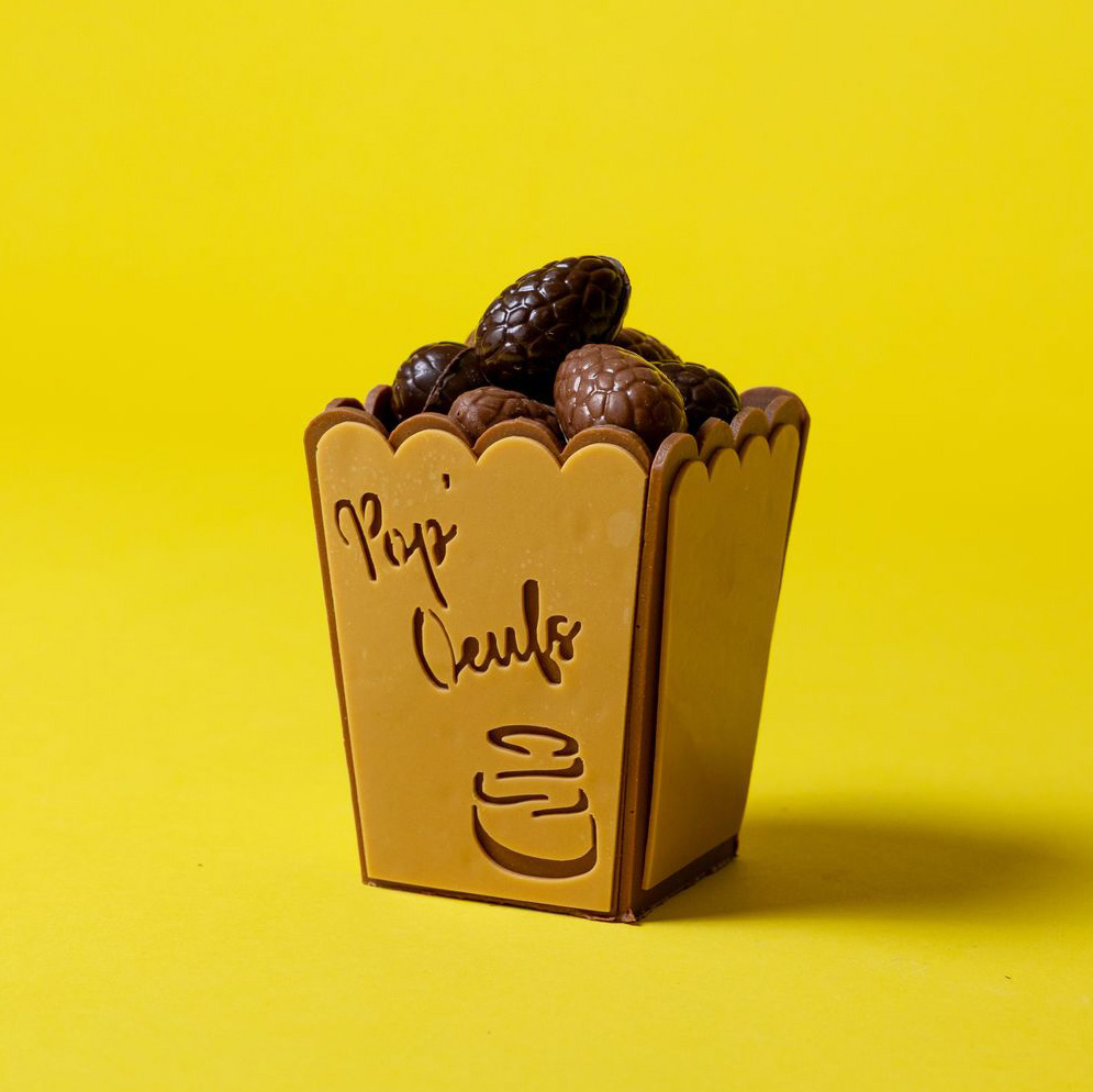 Sujet en chocolat blond 35% garni d’œufs pralinés faits maison et de fritures assorties au chocolat noir, lait blond et blanc :